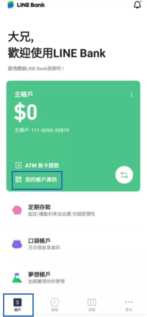 開啟LINE Bank的APP點選『帳戶』,在點選『我的帳戶資訊』